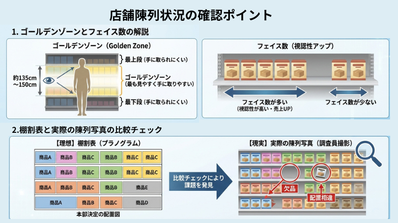 - 棚割の遵守: 本部が決定した「棚割表(プラノグラム)」通りに陳列されているか。