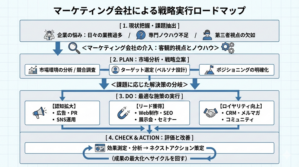 マーケティング会社の最大の役割は、企業のマーケティング活動における「Plan(計画)」「Do(実行)」「Check(評価)」「Action(改善)」のサイクルを回し、成果を最大化することです。