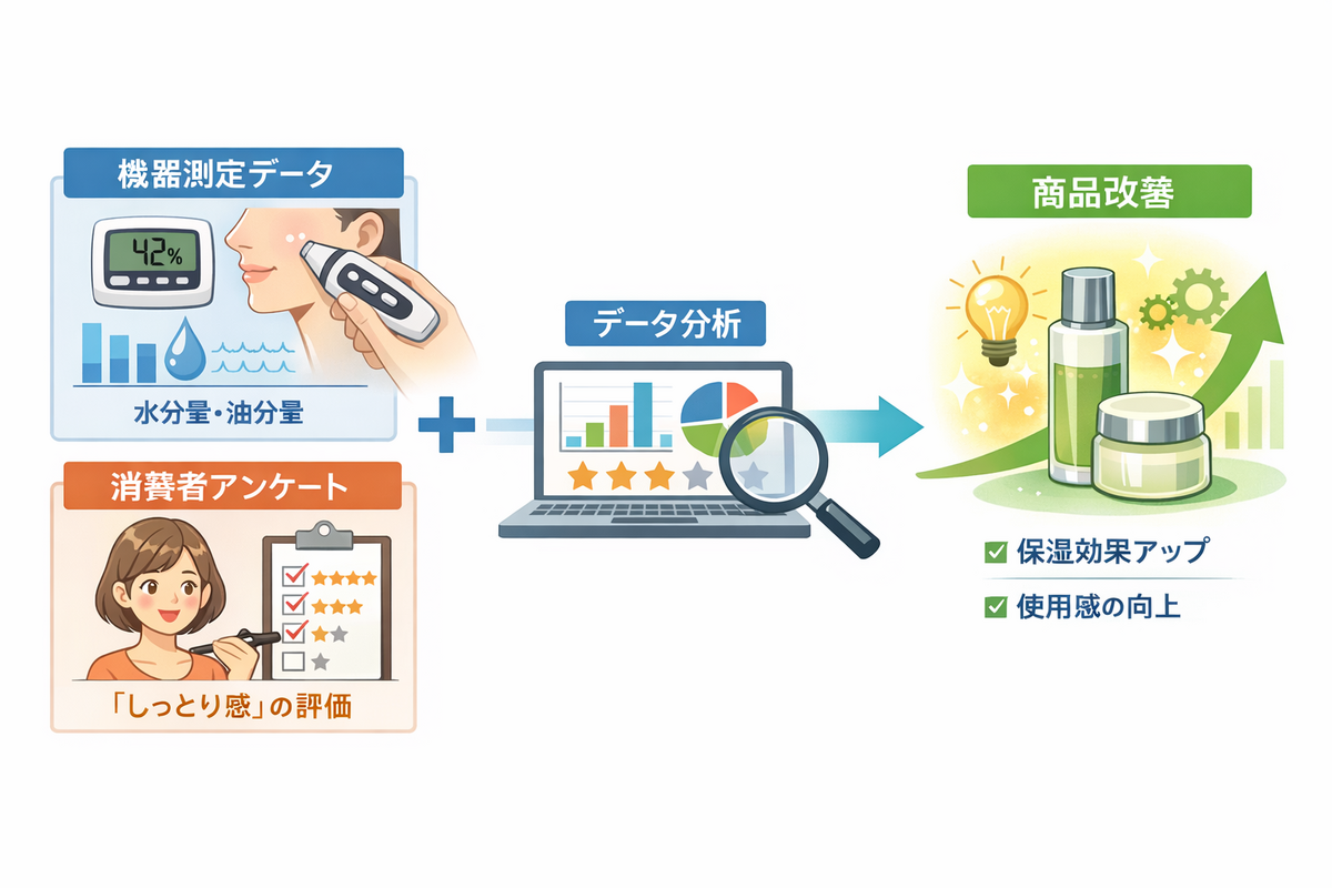 こうした主観的な感覚を、統計的なデータとして客観視するために行われるのが使用感調査です。研究室での機器測定データ(物性データ)と、消費者による官能評価データ(感性データ)を掛け合わせることで、より市場ニーズに即した商品開発が可能になります。