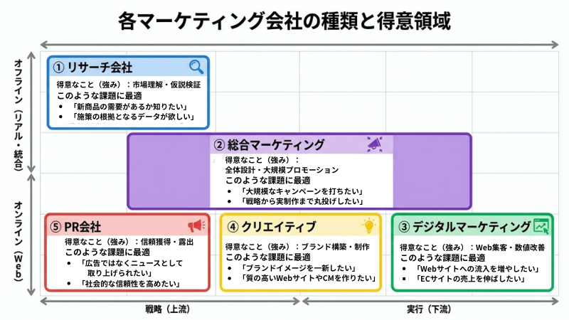 マーケティング会社は主に以下の5つのタイプに分類できます。