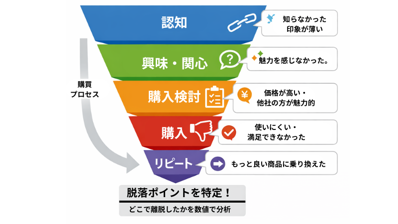 - 要因特定:なぜ選ばれているのか、なぜ離脱したのか、ボトルネックがわかる。