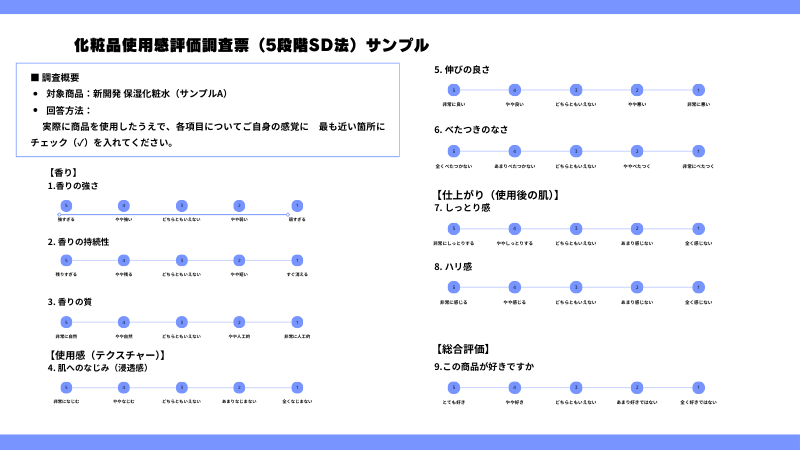 また、テクスチャーの評価においても、「しっとり感」「伸びの良さ」「浸透感」「べたつきのなさ」「仕上がりのハリ感」など、商品特性に合わせた項目を用意します。一般的に、5段階または7段階のSD法(Semantic Differential scale)を用いて、「非常にそう思う」から「全くそう思わない」までの度合いを測定します。
