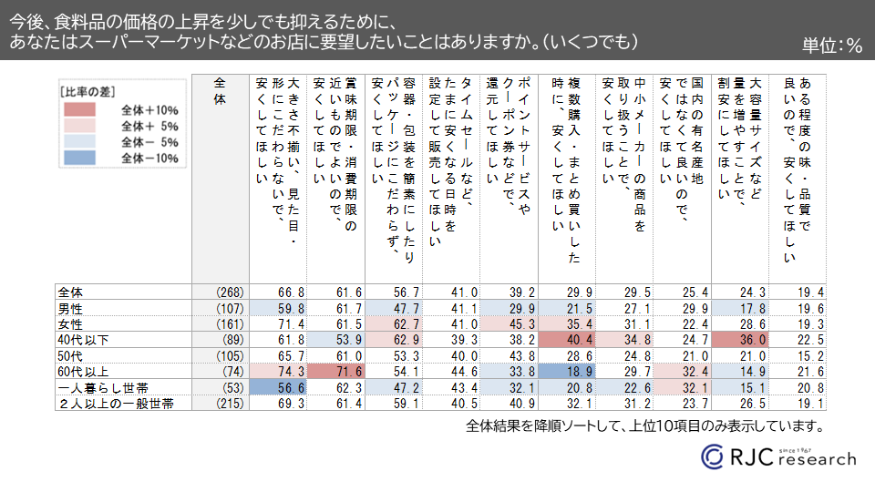 - 食料品の価格上昇を抑えるためにスーパーなどのお店に要望したいことは、 「大きさ不揃い、見た目・形にこだわらないで、安くしてほしい」 「賞味期限・消費期限の近いもので良いので、安くしてほしい」 「容器・包装を簡素にして、パッケージにこだわらず、安くしてほしい」 など。